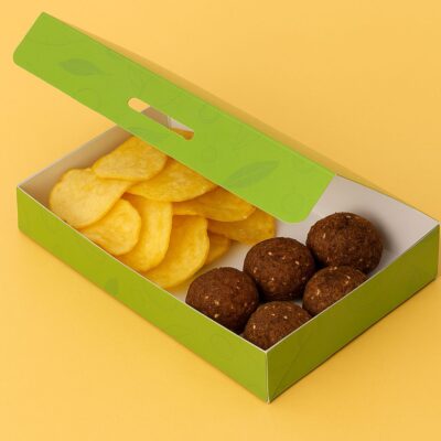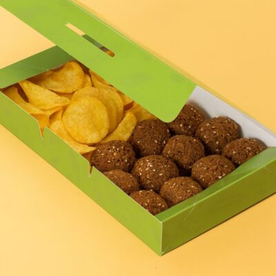 بوكس متكامل يضم فلافل، شيبس، شكشوكة، صحن خضار، حمص، وفول، وجبة شهية ومشبعة.