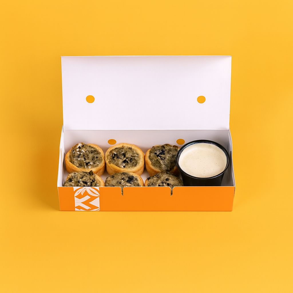 ستة قطع صغيرة من العجين الطري المحشو بخليط اللحم المتبل، تُخبز لتكون ذهبية ولذيذة، مثالية كوجبة خفيفة أو مشاركة.